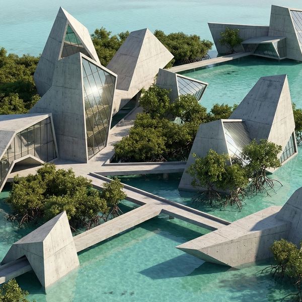 Conceptual Hospitality Architecture The Mangrove Hotel is a future-oriented hospitality concept developed for coastal environments in the UAE, where environmental responsibility and long-term value are increasingly central to development strategy. Conceived as an integrated architectural system, the project minimizes ground impact by elevating built volumes and organizing circulation through bridges and platforms that preserve mangrove ecosystems and natural tidal flow. The site i