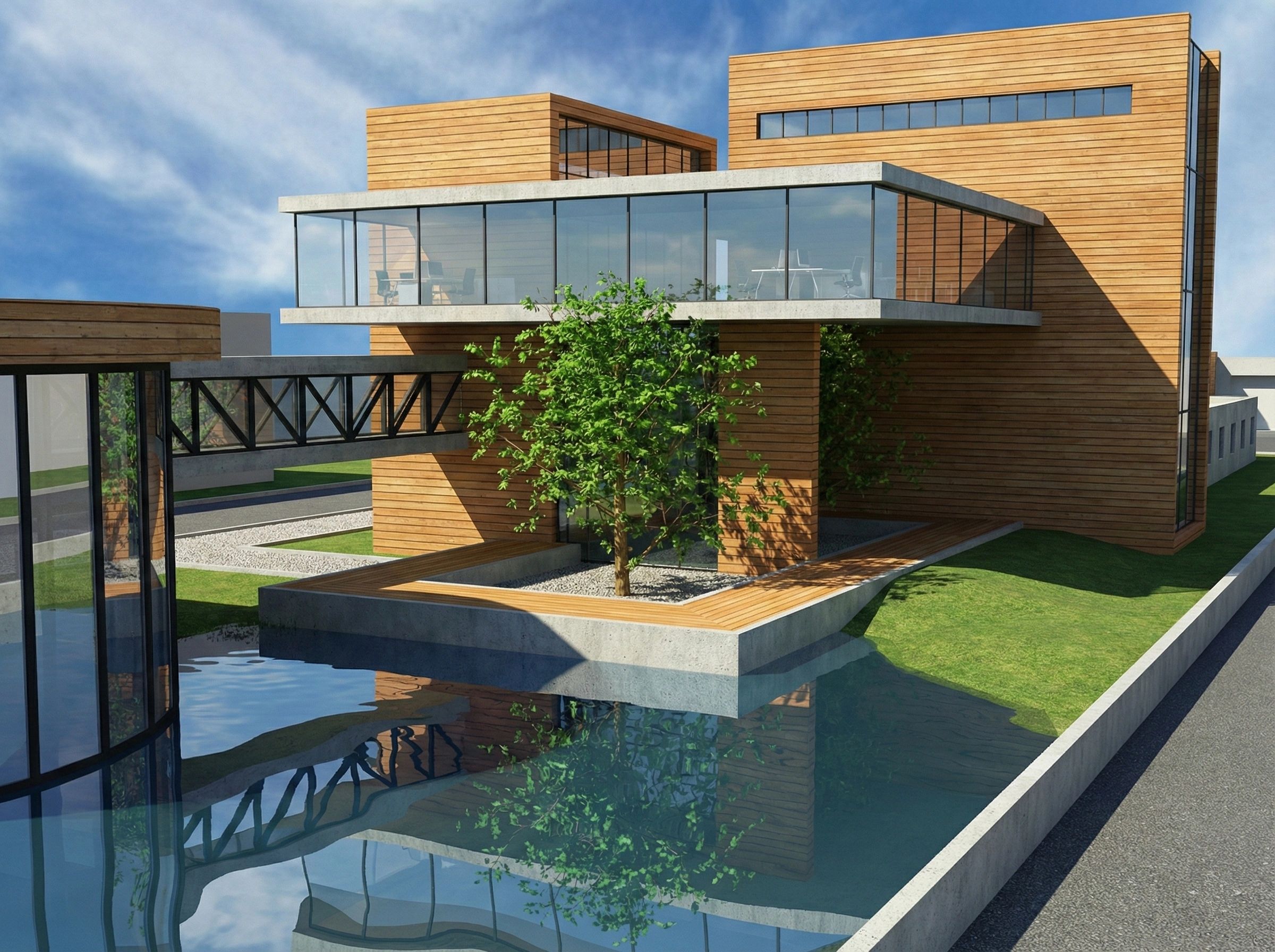 The core idea was to contrast and complement the existing factory structure.